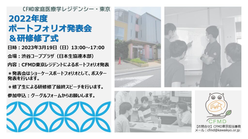 【CFMD家庭医療学レジデンシー・東京からのお知らせです】2022年度のポートフォリオ発表会&研修修了式を開催します。久しぶりの現地開催となります。当日はCFMD東京所属のレジデントがポスター形式でポートフォリオ発表を行います。各学年のレジデントのそれぞれの学び、気づきをぜひご覧ください。尚、時節柄、参加人数を把握したいため、参加希望の方はグーグルフォームから登録にご協力お願いします。
